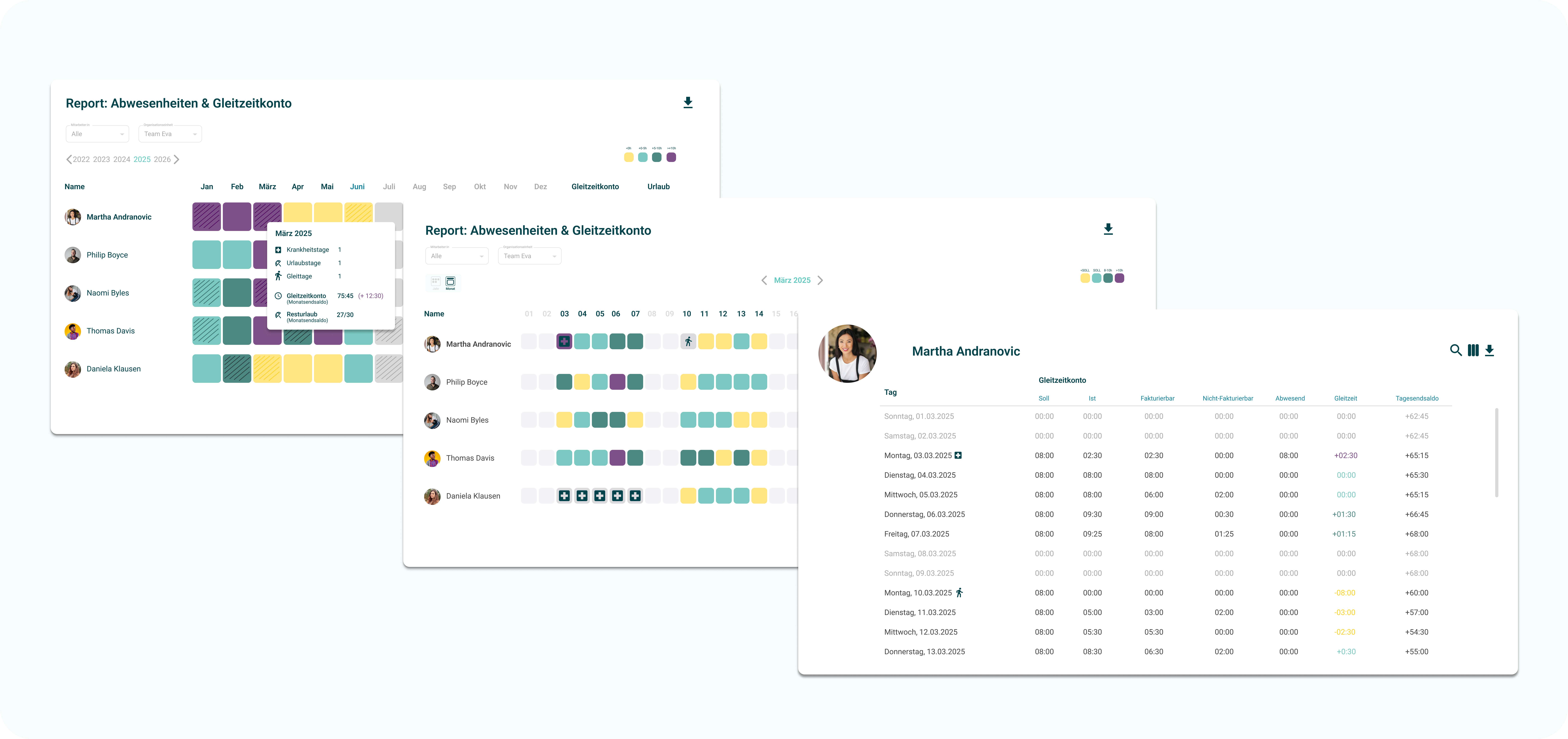 Auch für Mitarbeiter:innen selbst bietet der Report viele Vorteile. Sie können jederzeit den aktuellen Stand ihres Stundenkontos einsehen, ihren Resturlaub überprüfen und geplante Urlaubs- und Gleittage auf einen Blick erfassen. Das erspart lästiges Nachfragen bei HR und sorgt für eine bessere individuelle Planung.